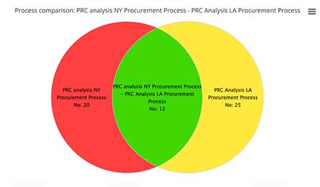 Another way to view the result is via a simple Venn diagram. Here you see that 12 steps have things in common , 20 steps in process 1 are not in the intersection ad 23 from process 2 are no in the intersection.