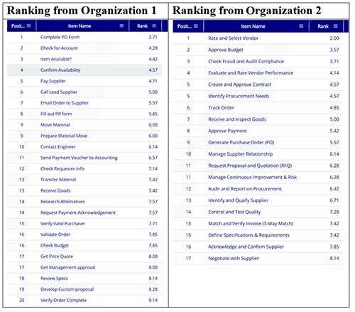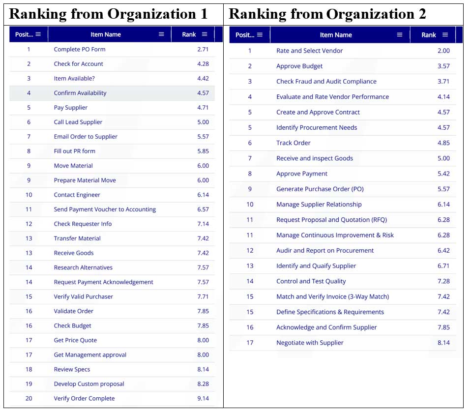 - Note that Organization 1 is more detailed than 2, also, 2 has more general process steps indicating it is most likely a parent process. The follow on task is to make sure the processes are at the same level in the process hierarchy to do the ranking analysis.